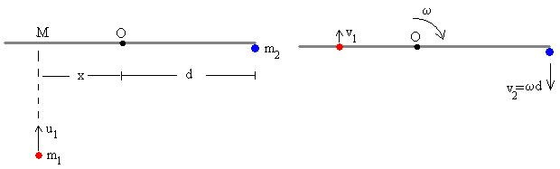 Conservación del momento angularEn la figura, observamos el dispositivo antes del choque. Una partícula de masa m1 que lleva una velocidad constante u1 choca contra una varilla de masa M y de longitud 2d que está inicialmente en reposo y que puede girar alrededor de un eje fijo, perpendicular a la varilla y que pasa por su centro. Una partícula de masa m2 permanece en reposo en el extremo de la varilla. Al chocar la partícula de masa m1 con la varilla a una distancia x de su eje, la varilla gira y mueve a la partícula de masa m2. La varilla es el mecanismo intermedio que permite transferir parte de la energía de la primera partícula a la segunda El sistema formado por las dos partículas y la varilla no es aislado, ya que la varilla está sujeta por su eje central. El momento de las fuerzas exteriores respecto del eje de rotación O es nulo, por lo que se conserva el momento angular Antes del choque la varilla y la partícula de masa m2 están en reposo. El momento angular inicial respecto de O es Li=m1u1·x Después de la colisión, la partícula incidente se mueve con velocidad v1, la velocidad angular de rotación de la varilla es ω, y la velocidad de la segunda partícula es v2=ω·d. El momento angular final respecto de O es