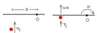 La definición de coeficiente de restitución e, aplicada al choque entre la primera partícula y un punto de la varilla situado a una distancia x del eje de rotación, nos proporciona la segunda ecuación. v1-ωx=-e(u1-0)