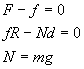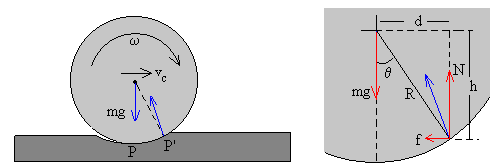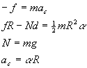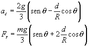 La reacción N no se aplica en el punto de contacto entre la rueda y el plano, sino que pasa por delante del centro de masas a una distancia d del mismo. Su existencia se justifica como ya hemos visto en que el plano y la rueda se deforman ligeramente en la zona de contacto. El valor del brazo d depende de diversos factores entre ellos la velocidad con que baja rodando el cuerpo, pero supondremos que es constante. Como vemos en la figura, el momento de la reacción N=mgcosq ya no es nulo sino que se opone al momento de la fuerza Fr. Las ecuaciones del movimiento son ahora las siguientes: