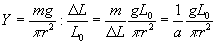 En la práctica real se calcula y representa la recta que mejor ajusta a los datos experimentales por el procedimiento de los mínimos cuadrados. En el programa interactivo, se proporciona le valor de la pendiente a de la recta DL=a·m . A partir de este dato, se calcula el módulo de Young. Sea a=DL/m la pendiente de la recta en m/kg. El módulo de Young se calcula a partir del valor de la pendiente a Supongamos que se ha realizado la "experiencia" con un hilo