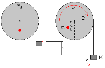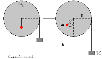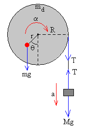 En esta página, se estudia un sistema oscilante, que consiste en un disco de masa md y radio R. que puede girar alrededor de un eje perpendicular al disco y que pasa por su centro. Se pega una masa puntual m a una distancia r de su centro. Se equilibra el sistema, colgando una masa M de una cuerda enrollada al disco, tal como se muestra en la figura.