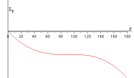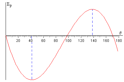 En la figura, vemos que la función Ep(θ) presenta un mínimo para θe=41º, y un máximo para 180- θe=139º Cuando mr=MR el máximo y el mínimo coinciden en θ=90º que es el punto de inflexión. Cuando MR>mr la función energía potencial es una función decreciente de θ.