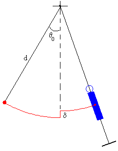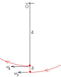 Séptima etapaLa séptima etapa es similar a la tercera etapa. El columpio parte de la posición de equilibrio estable θ=0, con una velocidad angular inicial ω4, alcanzando un desplazamiento máximo θ2 que se obtiene aplicando el principio de conservación de la energía Como ω4> ω3 el máximo desplazamiento θ2 > θ1 Relacionamos ambos desplazamientos mediante la fórmula La energía total es E4=mg(d-δ)(1-cosθ2)+mgδ=mgd(1-cosθ2)+mgδcosθ2 Octava etapa