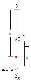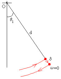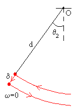 La fuerza F tiene el mismo sentido que el desplazamiento, el trabajo es positivo Hemos comprobado que el trabajo realizado por las fuerzas interiores para elevar el c.m. es igual a la diferencia entre la energía final y la inicial. Tercera etapaTenemos ahora la situación opuesta a la primera etapa, el columpio con una velocidad angular inicial ω2 en la posición θ=0, alcanza un máximo desplazamiento angular θ1. Aplicando el principio de conservación de la energía El ángulo máximo θ1 que se desvía el columpio es, combinado las expresiones anteriores como d>(d-δ) resulta que θ1>θ0 La energía total es E2=mg(d-δ)(1-cosθ1)+mgδ=mgd(1-cosθ1)+mgδcosθ1 Cuarta etapa