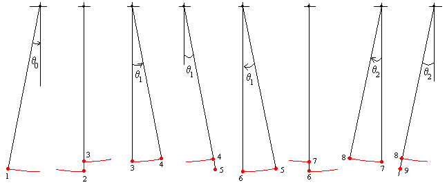 En la figura se muestra un ciclo completo de operación del columpio 1.-La energía inicial es E1=mgd(1-cosθ0)=m·9.8·1.0·(1-cos10º)=0.15·m 2.-Se aplica el principio de conservación de la energía. La velocidad angular ω1 en la posición de equilibrio es La energía E2=E1 3.-El centro de masa asciende, se conserva el momento angular md2·ω1=m(d-δ)2·ω2, ω2 =0.62 rad/s La energía total es 4.-La energía cinética se convierte en energía potencial, el columpio se desvía un ángulo θ1 La energía E4=E3 5.-El centro de masas desciende, la energía total es E5=m9.8·1(1-cos11º)=0.18·m 6.-Se aplica el principio de conservación de la energía. La velocidad angular ω3 en la posición de equilibrio es La energía E6=E5 7.-El centro de masa asciende, se conserva el momento angular md2·ω3=m(d-δ)2·ω4, ω4 =0.68 rad/s La energía total es 8.-La energía cinética se convierte en energía potencial, el columpio se desvía un ángulo θ2 La energía E8=E7 9.-El centro de masas desciende, la energía total es E9=m9.8·1(1-cos12º)=0.22·m 10.-Comienza un nuevo ciclo. Los desplazamientos máximos se pueden calcular mediante las fórmulas