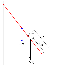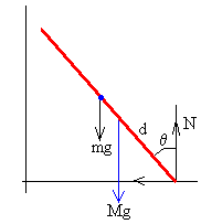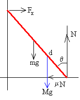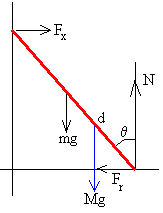 Escalera apoyada en dos paredes perpendiculares por la que sube una persona.Supongamos una escalera homogénea de masa m y longitud L apoyada en dos paredes perpendiculares. Un hombre de masa M sube por la escalera hasta un peldaño situado a una distancia d del extremo inferior de la escalera, vamos a estudiar el comportamiento del sistema formado por la escalera supuesta una varilla homogénea y el hombre supuesto una masa puntual. Estática