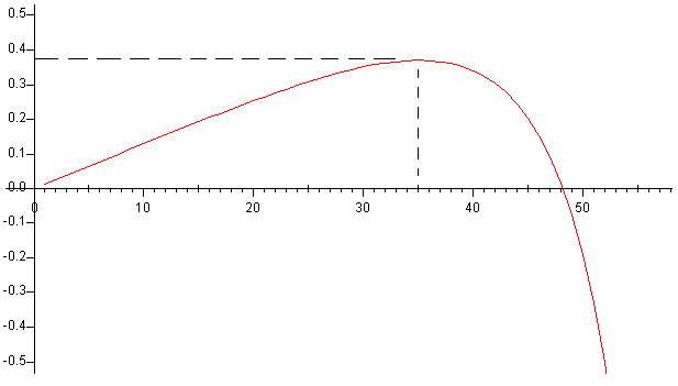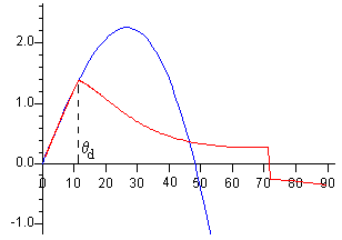 Si el lápiz se suelta cuando hace un ángulo θ0 próximo a cero, cosθ0≈1 Las raíces son cosθ1=1/3 y cosθ2=9/11 Los correspondientes ángulos son θ1=70.5º y θ2=35.1º. La primera N→0 y F/N→-∞ (es un mínimo), la segunda (F/N)máx=0.371 es un máximo tal como se aprecia en la figura más arriba.