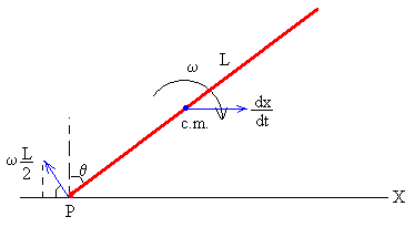 La velocidad de la punta del lápiz P, es la suma de la velocidad de traslación del c.m. dx/dt y la velocidad debida a la rotación alrededor de un eje perpendicular al lápiz y que pasa por el c.m. ωL/2