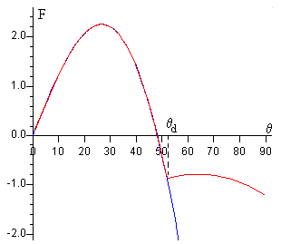 Que son las mismas expresiones que obtuvimos al estudiar la caída de una varilla inclinada sujeta por uno de sus extremos. Hemos llegado a la misma solución pero con un planteamiento distinto. En la figura, se muestra el valor del cociente F/N en función del ángulo θ, cuando el lápiz se inclina ligeramente θ0=1º respecto de la posición vertical y se suelta.