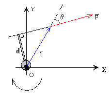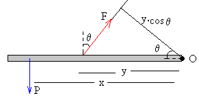 Equilibrio de una barraSupongamos una barra de masa despreciable, que está sujeta por su extremo O. Si colocamos un peso P a una distancia x del origen. El momento de esta fuerza respecto del origen O es +P·x. Atamos una cuerda a una distancia y del origen, y tiramos de ella haciendo un ángulo θ con la vertical, tal como se muestra en la figura. El momento de la fuerza F respecto del origen es -F·y·cosθ.