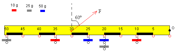 ActividadesSea una barra de 50 cm de longitud, de masa despreciable, dispone de ganchos situados en las divisiones 0, 5, 10, ... 50 cm. La barra está sujeta por uno de sus extremos O. Se introduce