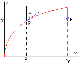 Para obtener una solución de la ecuación diferencial, multiplicamos por dφ/ds la ecuación diferencial La constante de integración la determinamos sabiendo que φ(L)= φ0, donde φ0 es la pendiente desconocida en el extremo libre de la barra y que dφ/ds=0 para s=L. La Longitud L de la barra y las coordenadas x e y de cada uno de los puntos de la misma se obtienen Dada la fuerza F aplicada en el extremo libre de la barra y conocida la longitud L de la barra, se resuelve la primera ecuación para calcular el ángulo φ0, que forma la recta tangente a la barra en su extremo libre con el eje vertical Y Una vez que se conoce este ángulo φ0, se calcula la abscisa x dando valores al ángulo φ en el intervalo (0, φ0) El cálculo de la ordenada y es más complicado, ya que para cada valor del ángulo φ hay que hallar una integral definida en el intervalo (0, φ) empleando procedimientos numéricos.