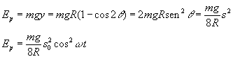 Integrando x’ e y’ con las condiciones iniciales q=0, x=0, y=0. x’=r·senθ+R(2θ+sen2θ) Esta no es la ecuación de una cicloide salvo que r→0 Comprobación En la figura, vemos que al punto P(x’, y’) es un punto de la curva C’ le corresponde el punto Q(x, y) de la curva C. La relación entre x’ y x, y entre y e y’ es x=x’-r·senθ La curva C que describe el c.m. es una cicloide invertida (-π/2<θ< π/2) cuyo mínimo está en (0, r) y cuyo disco generador tiene un radio R. Sin embargo, la curva C’ sobre la que rueda el cuerpo sin deslizar no es una cicloide salvo que el radio del cuerpo sea r=0. Movimiento Armónico SimpleCuando un cuerpo describe un MAS su desplazamiento (en este caso el arco s) se expresa en función del tiempo de acuerdo con la ecuación. s=A·sen(w t+j ) vc=w s0·cos(w t+j) Donde la amplitud A y la fase inicial j se determina a partir de las condiciones iniciales, en nuestro caso t=0, s=s0, vc=0. La rueda parte de la posición s0 con velocidad inicial cero. s=s0·sen(w t+p/2)=s0·cos(w ·t) La velocidad vc del c.m. de la rueda se obtendrá derivando s respecto del tiempo vc=-w s0·sen(w t) Balance energéticoEl balance energético es similar al que efectuamos al estudiar el movimiento de un cuerpo que baja rodando por un plano inclinado. Cuando la rueda se encuentra en la posición dada por el arco s a lo largo de la cicloide, o a una altura y sobre el origen. La energía potencial es La energía cinética es la suma de la energía cinética de traslación del c.m. y de rotación alrededor de un eje que pasa por c.m. donde se ha tenido en cuenta la relación entre ambas velocidades vc=w ·r para que ruede sin deslizar. La suma de la energía cinética Ek y potencial Ep es constante e igual a