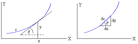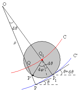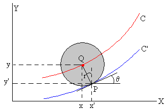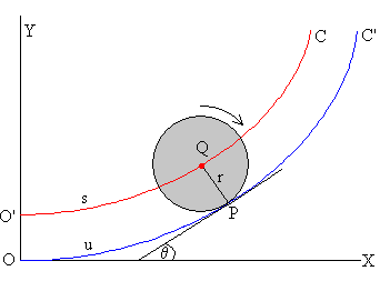 Movimiento de un cuerpo que rueda sobre una superficie cóncavaEn la figura, se muestra la curva C’ sobre la que rueda el cuerpo redondo de radio r y la curva C que describe el centro de dicho cuerpo. La variable u mide la distancia OP a lo largo de la curva C’. Mientras el c.m. se desplaza s a lo largo de la curva C el cuerpo gira un ángulo φ. El ángulo θ mide la pendiente de la recta tangente a la curva C’ en P La ecuación del movimientoLas fuerzas sobre el cuerpo: