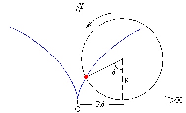 La relación entre la velocidad de traslación del centro de masas vc y de rotación w alrededor de un eje que pasa por el c.m. es vc=w ·R. La ecuaciones paramétricas de la cicloide son x=R(q +senq )