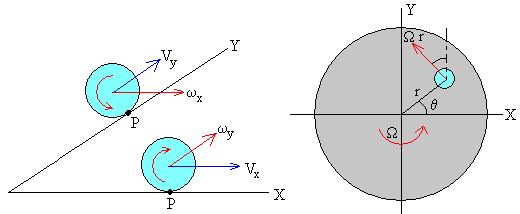 Las componentes de la velocidad del punto de contacto P de la esfera con la plataforma son: vx=Vx-ωy·R Si el punto de contacto P dista r del eje de rotación de la plataforma que gira con velocidad angular W. Las componentes de la velocidad del punto P vx=-W·r·senθ=-W·y Para que la esfera ruede sin deslizar, el punto de contacto P debe de estar en reposo respecto de la plataforma. Se cumplirá por tanto, -W·y=Vx-ωy·R Las fuerzas sobre la esfera son: