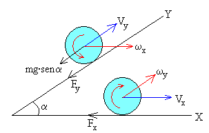 Trayectoria del c.m. de la esferaTenemos que resolver un sistema de dos ecuaciones diferenciales acopladas. Para desacoplarlas, despejamos Vy de la primera ecuación y la introducimos en la segunda. La solución de esta ecuación diferencial (similar a la de un MAS) es de la forma Vx=Acos(k·t)+B·sen(k·t)+c donde k=2W/7 Introduciendo Vx en la ecuación diferencial, obtenemos la solución particular c de la ecuación diferencial de segundo orden. A partir de la expresión de Vx, obtenemos la componente Vy de la velocidad del c.m. Las constantes A y B se determinan a partir de las condiciones iniciales. En el instante t=0, las componentes de la velocidad del c.m. son (V0x, V0y). Podemos escribir estas ecuaciones de forma general definiendo dos variables, cuyo significado veremos más adelante. Vx=(V0x-Vd)·cos(ωct)-V0y·sen(ωc·t)+Vd Sabiendo que en el instante t=0, la posición del centro de la esfera es (x0, y0), calculamos la abscisa x del centro de la esfera integrando la expresión de la velocidad Vx en función del tiempo. Se hace lo mismo para la ordenada y. Podemos escribir de forma alternativa esta ecuación de la forma Elevando al cuadrado y sumando Se trata de la ecuación de una circunferencia centrada en el punto (a, b) y de radio Rc (x-a)2+(y-b)2=Rc2 donde El centro se mueve a lo largo del eje X (no a lo largo del plano inclinado) con velocidad Vd., que se denomina velocidad de deriva.