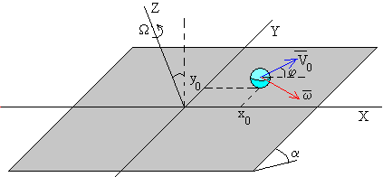 Ecuaciones del movimiento de la esferaPara describir el movimiento de la esfera situamos el Sistema de Referencia Inercial del siguiente modo: eje Y a lo largo de la plataforma inclinada un ángulo α, el eje X perpendicular al mismo y el eje Z perpendicular al plano de la plataforma, tal como se muestra en las figuras.