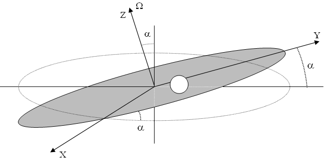 La situación física que se estudia en esta página, es el de una esfera sólida que rueda sin deslizar sobre una plataforma giratoria inclinada un ángulo α. Este problema está conectado con el movimiento de una partícula cargada en un campo eléctrico y magnético cruzados.