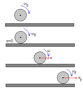 Planteamos el problema de modo general. Un disco perfectamente rígido de masa m y de radio R que rueda sobre una superficie horizontal perfectamente rígida. Su velocidad inicial de traslación de su centro de masa v0 y la velocidad angular inicial de rotación alrededor de un eje que pasa por su centro de masa w0. Determinar la velocidad angular w, y la velocidad de su centro de masas v, cuando el disco rueda sin deslizar v=w·R.