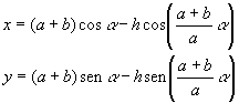En la figura, se muestra la geometría de la epitrocoide en la cual un círculo de radio b rueda por el exterior de un círculo fijo de radio a. La distancia OC entre los centros de ambos círculos es (a+b), y sea h la distancia entre el centro del círculo móvil C y el punto P. En la figura de la izquierda, se muestra la situación inicial y en la figura de la derecha, la situación al cabo de un cierto tiempo t, cuando la línea que une los centros de ambos círculos OC forma un ángulo a con la horizontal. El ángulo b girado por el radio CP está en relación inversa al radio del círculo móvil. Como vemos en la figura, los arcos (en azul) tienen la misma longitud, por tanto, a·a =b·b Las coordenadas del punto P serán x=(a+b)·cosa +h·sen(a +b -90) o bien,