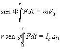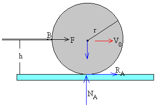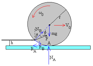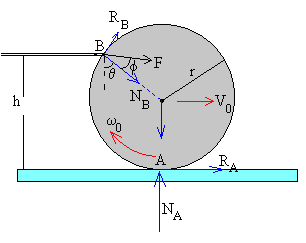 Donde RB=F·senf . Vamos a suponer que durante el breve intervalo de tiempo t que dura el impacto, se puede despreciar el rozamiento RA de la bola con el tapiz, frente a la componente horizontal F·senF de la fuerza que ejerce el taco, con tal que el rozamiento RB del taco y la bola sea suficientemente grande y el golpe no sea demasiado alto hà 2r. Bajo estas condiciones las ecuaciones del impulso lineal y angular se convierten en El impulso de la fuerza F es la cantidad desconocida que eliminamos de ambas ecuaciones. Para una esfera de masa m y radio r, el momento de inercia Ic=2mr2/5. La relación entre las velocidades iniciales de traslación del c.m.V0 y de rotación alrededor de un eje que pasa por el c.m. w0 es Teniendo en cuenta que mB=tgf , F =f