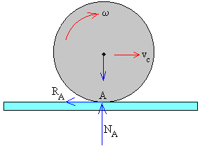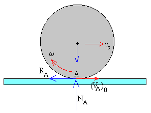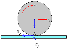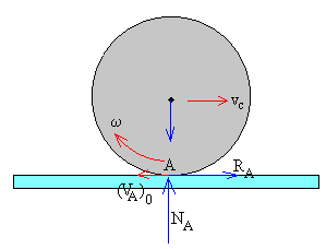 La velocidad del c.m. crece y la velocidad de rotación decrece La velocidad del punto de contacto A viene dada por VA=vc-w r y llegará un momento que se anule a partir del cual la bola de billar rodará sin deslizar con velocidad constante. La velocidad inicial del punto de contacto A de la bola con el tapiz es positivaLa fuerza de rozamiento RA será negativa
