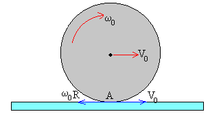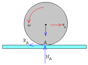 La velocidad del c.m. decrece y la velocidad de rotación también decrece Aquí surgen dos posibilidades que vc se anule antes que w o bien, que w se anule antes que vc. Normalmente, se anula w antes que vc de modo que la bola no retrocede. La velocidad angular se hace cero w =0 en el instante en dicho instante la velocidad del c.m. es Se establece el movimiento de rodar sin deslizarEn el momento en que se anula la velocidad angular de rotación, la velocidad del centro de masas y la velocidad del punto de contacto A de la bola con el tapiz se igualan. A partir de ese instante, la fricción RA entre la bola y el tapiz hace que aparezca una velocidad angular de rotación.