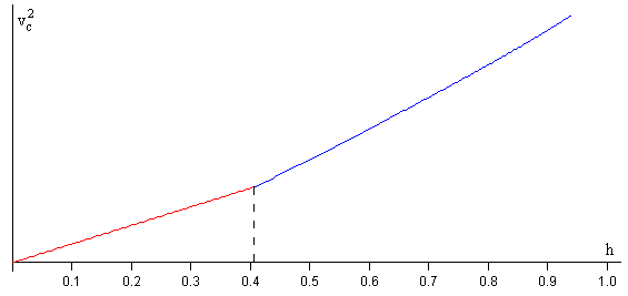 El ángulo crítico θc =24.2º En la figura, se representa en el eje horizontal las alturas h de partida del cuerpo h=x·senθ. En el eje vertical, los cuadrados de la velocidad del c.m. del cuerpo.