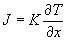 Ley de FourierSea J la densidad de corriente de energía (energía por unidad de área y por unidad de tiempo), que se establece en la barra debido a la diferencia de temperaturas entre dos puntos de la misma. La ley de Fourier afirma que hay una proporcionalidad entre el flujo de energía J y el gradiente de temperatura. Siendo K una constante característica del material denominada conductividad térmica. Consideremos un elemento de la barra de longitud dx y sección S. La energía que entra en el elemento de volumen en la unidad de tiempo es JS, y la que sale es JS. La energía del elemento cambia, en la unidad de tiempo, en una cantidad igual a la diferencia entre el flujo entrante y el flujo saliente. Esta energía, se emplea en cambiar la temperatura del elemento. La cantidad de energía absorbida o cedida (en la unidad de tiempo) por el elemento es igual al producto de la masa de dicho elemento por el calor específico y por la variación de temperatura. Igualando ambas expresiones, y teniendo en cuenta la ley de Fourier, se obtiene la ecuación diferencial que describe la conducción térmica