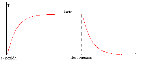 Se pulsa el botón titulado Conecta. Observamos como la temperatura del termómetro se incrementa. Si se activa la casilla titulada Gráfica, se obtiene la representación gráfica de la temperatura que marca el termómetro en función del tiempo. Cuando la temperatura alcance aproximadamente, su valor máximo constante (estado estacionario), el programa interactivo nos lo indica mediante un mensaje, se puede pulsar el mismo botón titulado ahora, Desconecta. La temperatura del termómetro va disminuyendo rápidamente, hasta que alcanza el valor de la temperatura del baño T0=0 ºC.