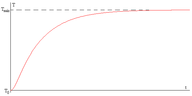 Hemos determinado la fase δn, ahora las frecuencias angulares ωn valen El régimen variable general de temperaturas de la barra es Solamente, queda por determinar los coeficientes an, lo que se conseguirá identificando esta solución con la distribución inicial de temperaturas en la barra T(x, 0)=T0 en el instante t=0. Hacemos la siguiente integración Para integrar hacemos el cambio de variable z=πx/L, dz= πdx/L Integramos dos veces por partes De acuerdo con estos resultados, despejamos los coeficientes an del desarrollo en serie Integramos de nuevo, por partes Fijarse que a+bπ=0 Así, la temperatura en cualquier punto de la barra x, en un instante t, se compone de la suma de un término proporcional a x, y de una serie rápidamente convergente que describe el estado transitorio. En la figura, se representa la temperatura de un punto x de la barra en función del tiempo t, después de haber conectado la fuente de calor en el instante t=0. Alcanza una temperatura Tmáx después de un tiempo teóricamente infinito.