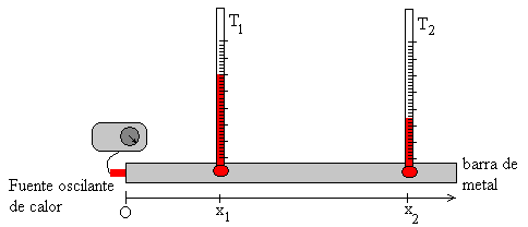 En esta página, se describe un experimento que nos permite estudiar la propagación de las ondas térmicas a lo largo de una barra de metal. Como aplicación, citaremos que las variaciones diurnas de temperatura penetran en el suelo más rápidamente pero con menor profundidad que las variaciones anules de temperatura debidos a los cambios de estación. Se puede explicar este fenómeno en términos de la velocidad de propagación y del amortiguamiento de la amplitud de la onda térmica que dependen de su frecuencia. Se calienta el extremo de una barra de cobre de L=50 cm de longitud de forma periódica con un soldador conectado a un reloj. Después de comenzar el experimento, se deja pasar cierto tiempo hasta que se alcanza un estado de equilibrio dinámico en el que las temperaturas de cada punto de la barra oscilan alrededor de sus valores medios. Se miden las temperaturas en dos puntos situados a una distancia x1 y x2 del origen de la barra. La relación entre las amplitudes de la oscilación térmica nos va proporcionar el valor del coeficiente de amortiguamiento y la diferencia de fase, la velocidad de propagación de las ondas térmicas en la barra. La relación entre estos dos parámetros nos proporciona el coeficiente a2 de la ecuación que describe la conducción térmica. donde α es un coeficiente que depende de la densidad ρ, calor específico c y conductividad térmica K del metal.
