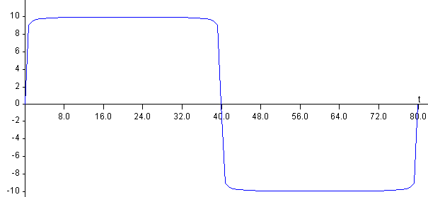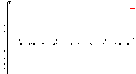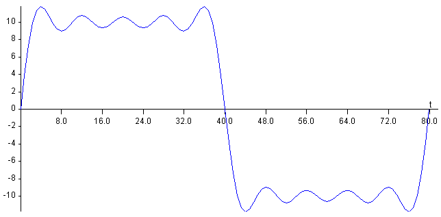 para 0≤t<P/2 Los coeficientes ai y bi de Fourier valen El resultado de la integral es El desarrollo en serie de la función escalón es En la figura, se representa el calentamiento del extremo de la barra x=0, descrito por una función escalón de periodo P=80 s y cuya amplitud es de T0=10º C. En la figura, se muestra la aproximación a la función escalón tomando los cinco primeros términos i=1, 3, 5, 7, y 9 del desarrollo en serie En esta otra figura, la aproximación a la función periódica tomando los 50 primeros términos cuyos índices i son los números impares que van desde i=1 a 99.