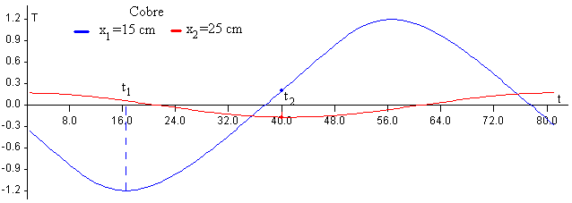 Observamos que en las posiciones x1=15 cm y x2=25 cm las oscilaciones de temperatura se describen aproximadamente mediante un MAS.